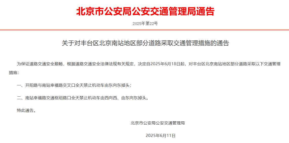 为保证道路交通安全顺畅,根据道路交通安全法律法规有关规定,决定自2025年6月18日起,对丰台区北京南站地区部分道路采取以下交通管理措施:一、开阳路与南站幸福路交叉口全天禁止机动车由东向东掉头;二、南站幸福路交通枢纽路口全天禁止机动车由西向西、由东向东掉头。